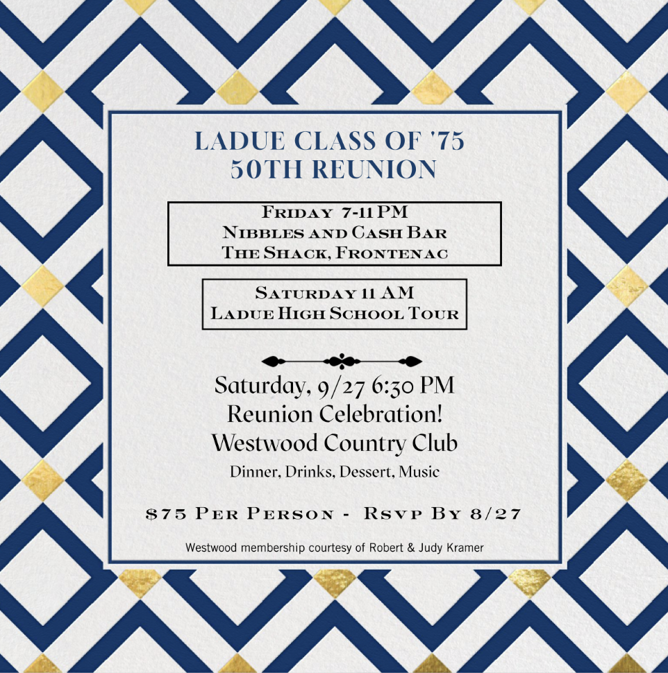 Invitations from Class of ‘75 Reunion Committee were emailed on 7/1.